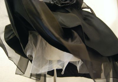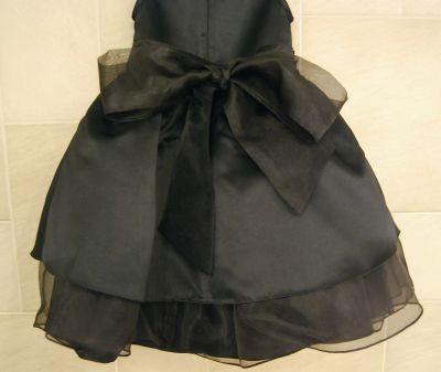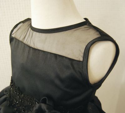後ろは、オーガンジーリボン。 取り外し可能なコサージュ付き 裏地にパニエ付き