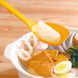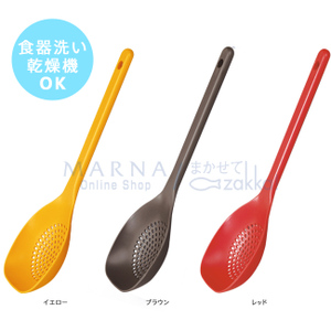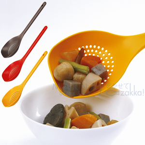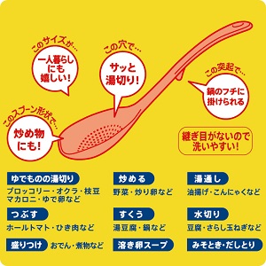 湯切り、つぶす、炒める、盛り付けるに使える便利なお玉です。下ふくらみのスプーン形状で、先端は平らでフライパンの底をすくうのにも便利です。 表面に継ぎ目や凸凹がないので洗いやすく、柄にフックにかけられる穴が開いています。