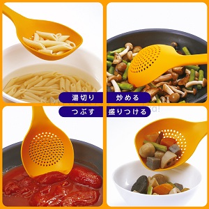 機能追加!柄と凸が鍋のフチにかけられて便利!湯きり・炒める・すくう・まぜる・盛り付ける
