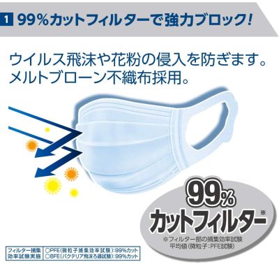 3層構造と超極細高機能フィルター採用で、ウイルス飛沫や花粉の侵入を防ぎます。フィルター捕集効率試験で99%カット。