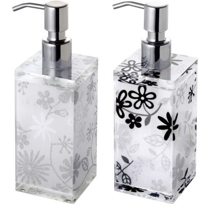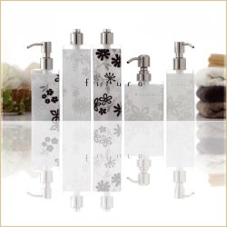 フラワーモチーフのテキスタイルが優しくバスルームを演出するローションボトルです。