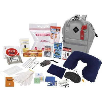 収納リュック・IDホイッスル&カラビナリング・静音アルミブランケット・携帯用トイレ・ポケットレインコート・軍手・FMラジオ(電池別売)・ケータイカラトリー・ダイナモLEDライト・マスク・ネックピロー・アイマスク・耳栓・ソーイングセット・防災の心得・カイロ・ウェットティッシュ・給水バッグ3L・ポリラップ・綿棒&絆創膏×各1