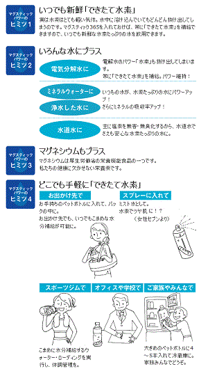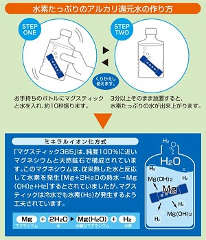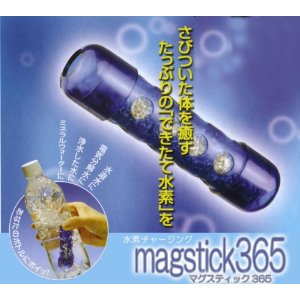 いつもの水が、水素たっぷりの水にパワーアップします。塩素軽減効果を併せ持つため水道水でさえも安心の水素たっぷり水に変えます。  水素チャージング マグスティック365」は、ミネラルイオン化方式による活性水素水生成器です。使い方カンタン。 くりかえし使えるケイタイ水素。  約1年間使用可能。(定期的にクエン酸でお手入れ。パワーが甦ります。)