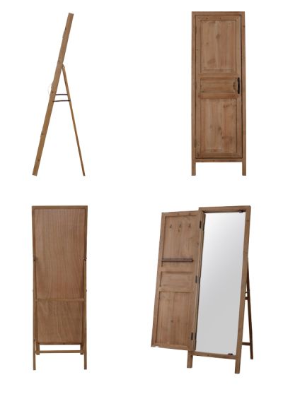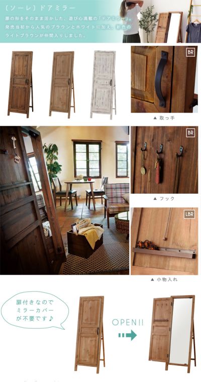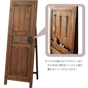 鏡を隠したい時には扉を閉めて、オブジェとしてお部屋のアクセントにもなります。また、扉の裏側にアクセサリーなどをかけるフックや小物が置けるトレーが付いており、朝の忙しい時間帯の身支度に一役やってくれます。