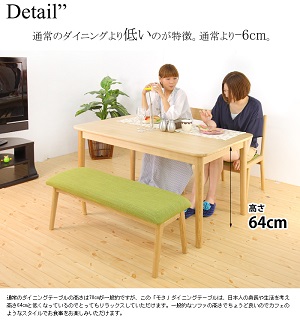 テーブルの高さは約64cmと一般的なダイニングテーブルに比べ、低めのロースタイルデザインとなっております。