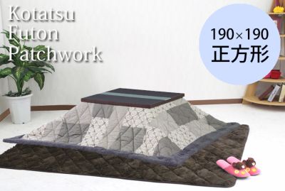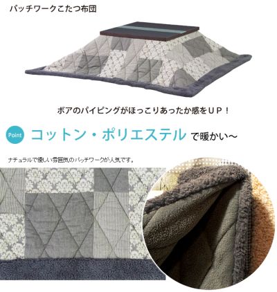 ふかふかふわふわのボアパイピングでぐるりと囲ったナチュラルなパッチワーク調こたつ布団。
