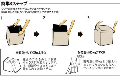 収納スペースに本やちょっとしたものを収納して収納上手に! 合皮を使用しているのでお手入れもラクラクです! シンプルな構造なので組立は簡単です。 使用しないときは簡単に折りたたんで収納できます。  座面のフタを外せば収納ボックスに早変わりします。 本、雑誌やちょっとした小物を入れて収納上手に。  耐荷重は80kgまでOK