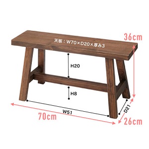 約幅70cm × 高さ36cm × 奥行き26cm 座面のサイズ:70cm × 20cm |