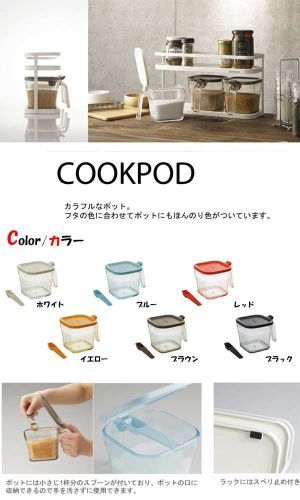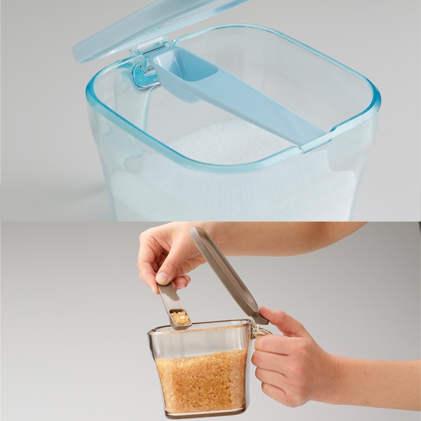 同じ商品同しで積み重ねでき、小さじ1杯が測れるスプーンが付属しています。